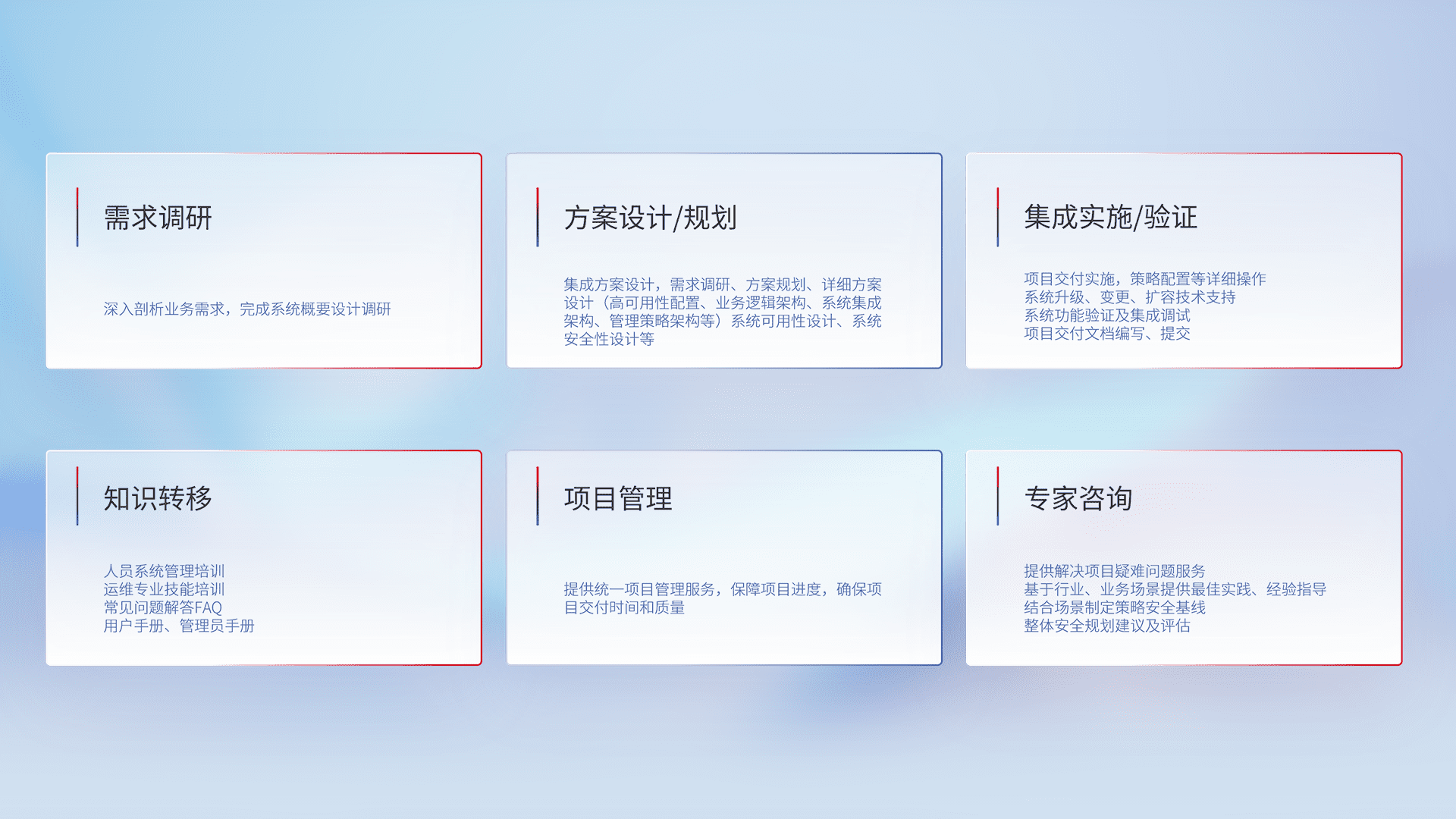 针对客户行业特性,,,,将宏观的安全战略和需求,,,,通过专业的交付服务,,实现项目落地,,,为客户提供标准规范的集成交付服务。。。。